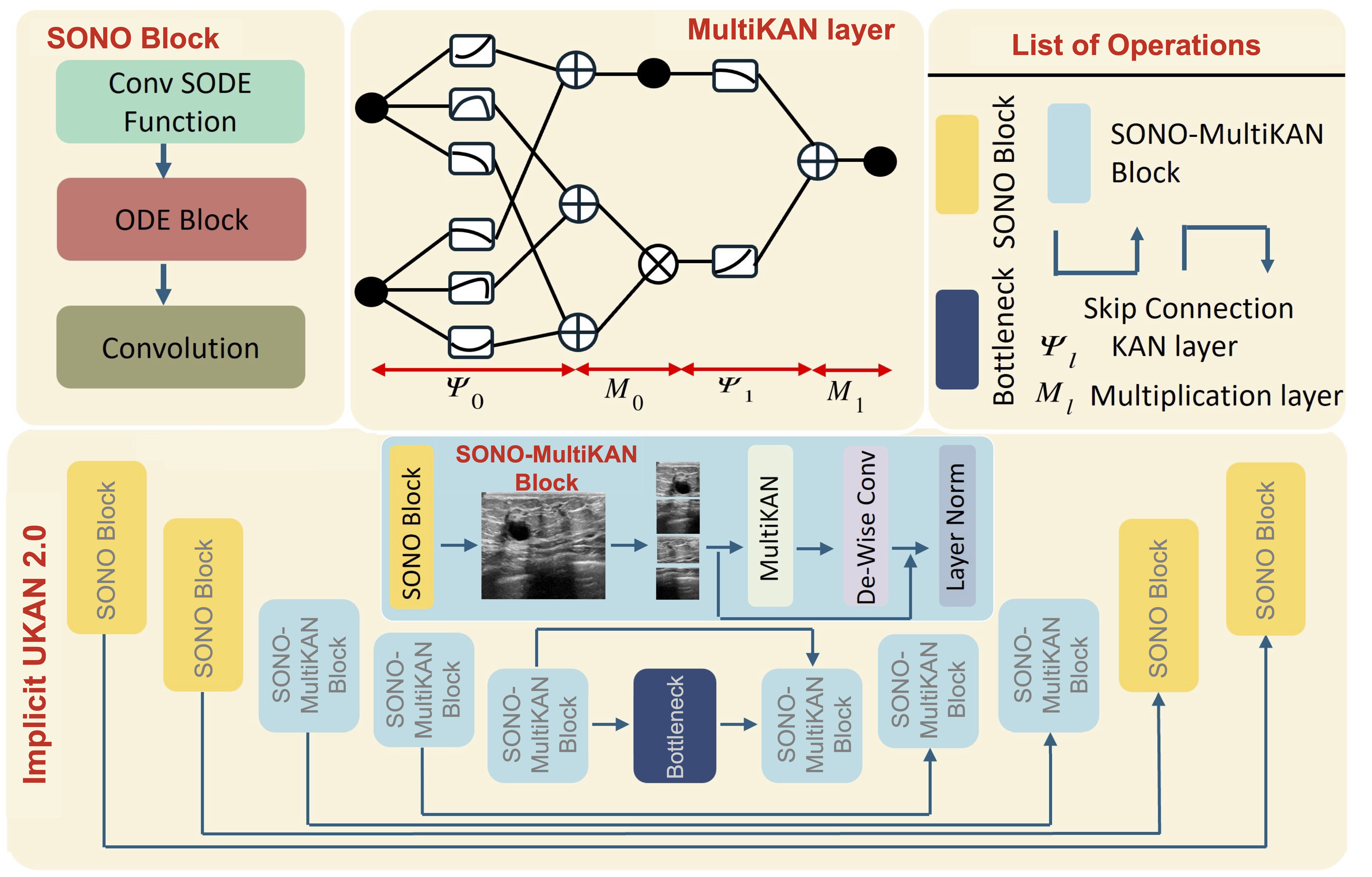 | Image segmentation is a fundamental task in both image analysis and medical applications. State-of-the-art methods predominantly rely on encoder-decoder architectures with a U-shaped design, commonly referred to as U-Net. Recent advancements integrating transformers and MLPs improve performance but still face key limitations, such as poor interpretability, difficulty handling intrinsic noise, and constrained expressiveness due to discrete layer structures, often lacking a solid theoretical foundation.In this work, we introduce Implicit U-KAN 2.0, a novel U-Net variant that adopts a two-phase encoder-decoder structure. In the SONO phase, we use a second-order neural ordinary differential equation (NODEs), called the SONO block, for a more efficient, expressive, and theoretically grounded modeling approach. In the SONO-MultiKAN phase, we integrate the second-order NODEs and MultiKAN layer as the core computational block to enhance interpretability and representation power. Our contributions are threefold. First, U-KAN 2.0 is an implicit deep neural network incorporating MultiKAN and second order NODEs, improving interpretability and performance while reducing computational costs. Second, we provide a theoretical analysis demonstrating that the approximation ability of the MultiKAN block is independent of the input dimension. Third, we conduct extensive experiments on a variety of 2D and a single 3D dataset, demonstrating that our model consistently outperforms existing segmentation networks. |