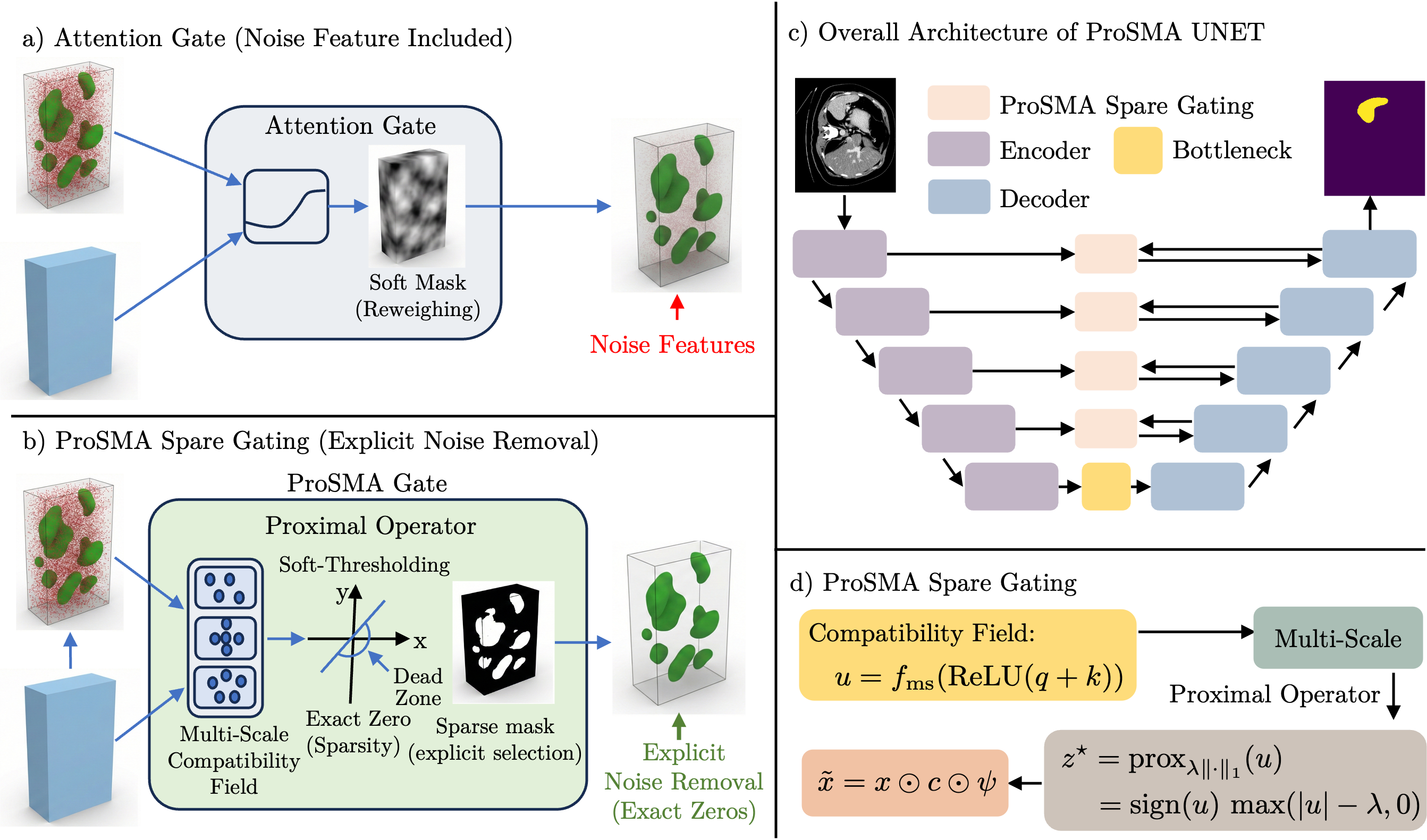 | Medical image segmentation commonly relies on U-shaped encoder-decoder architectures such as U-Net, where skip connections preserve fine spatial detail by injecting high-resolution encoder features into the decoder. However, these skip pathways also propagate low-level textures, background clutter, and acquisition noise, allowing irrelevant information to bypass deeper semantic filtering-an issue that is particularly detrimental in low-contrast clinical imaging. Although attention gates have been introduced to address this limitation, they typically produce dense sigmoid masks that softly reweight features rather than explicitly removing irrelevant activations. We propose ProSMA-UNet (Proximal-Sparse Multi-Scale Attention U-Net), which reformulates skip gating as a decoder-conditioned sparse feature selection problem. ProSMA constructs a multi-scale compatibility field using lightweight depthwise dilated convolutions to capture relevance across local and contextual scales, then enforces explicit sparsity via an 𝓁1 proximal operator with learnable per-channel thresholds, yielding a closed-form soft-thresholding gate that can remove noisy responses. To further suppress semantically irrelevant channels, ProSMA incorporates decoder-conditioned channel gating driven by global decoder context. Extensive experiments on challenging 2D and 3D benchmarks demonstrate state-of-the-art performance, with particularly large gains (≈20%) on difficult 3D segmentation tasks. |